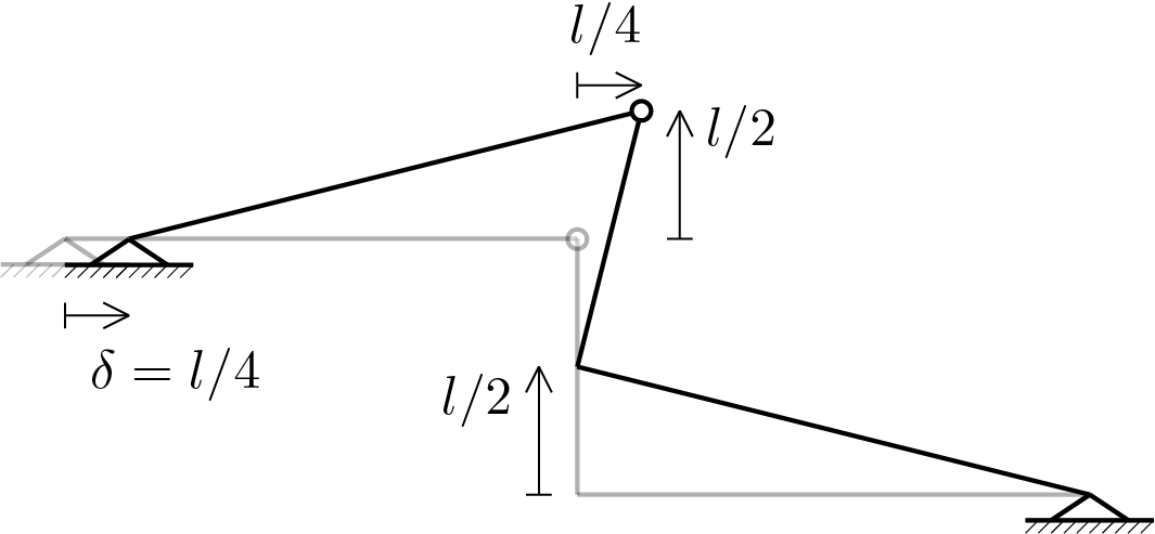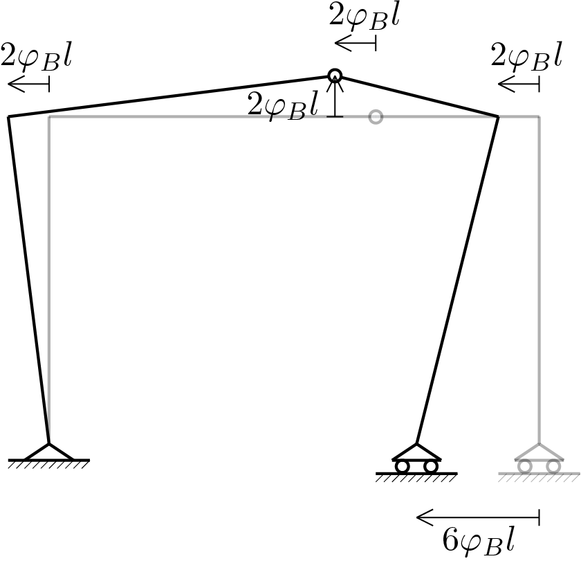 Since \(\textrm{min}(m,n) = 6 == \textrm{rango}\mat{A}\) and \(n == m\) then the system is kinematically determined. The solution of the linear system provides the values assumed by the Lagrangian parameters \(u_{1A}\text{,}\)\(u_{2A}\text{,}\)\(\varphi_{A}\text{,}\)\(u_{1B'}\text{,}\)\(u_{2B'}\text{,}\)\(\varphi_{B'}\text{.}\)