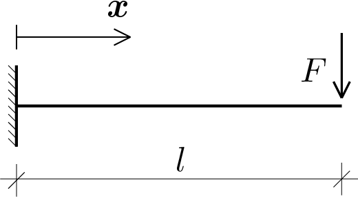 where the applied transversal distributed load is constant. Also in this case the boundary conditions are kinematic conditions at \(x=0\) and static conditions at \(x=l\text{:}\)