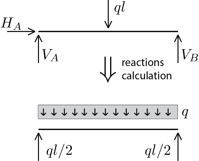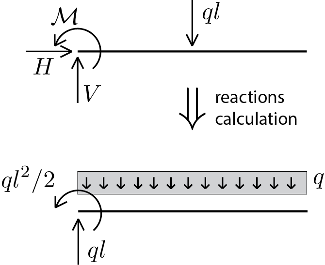 Note how the representation of the bending moment is carried out by changing the direction of the vertical axis of the diagram. This choice is used in professional practice to "visualize" which of the two edges of the beam, lower or upper, is under tensile condition.