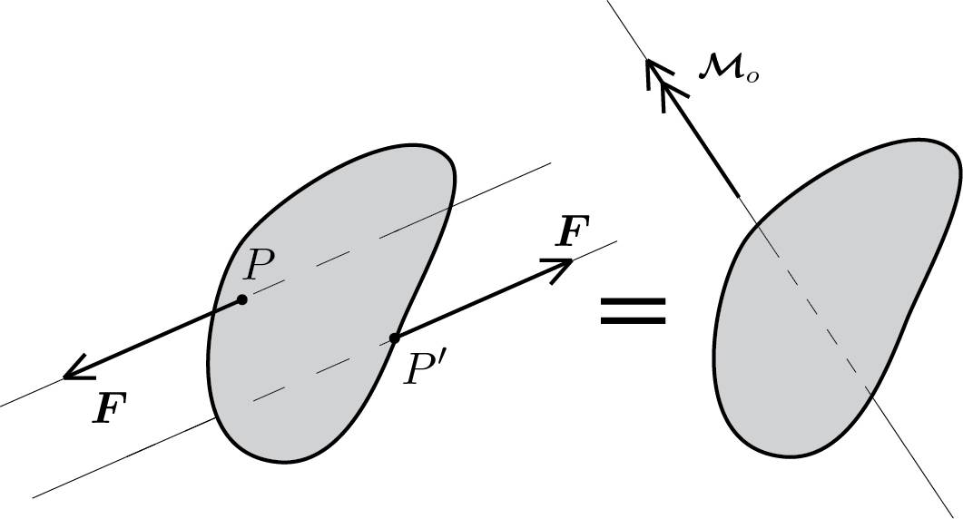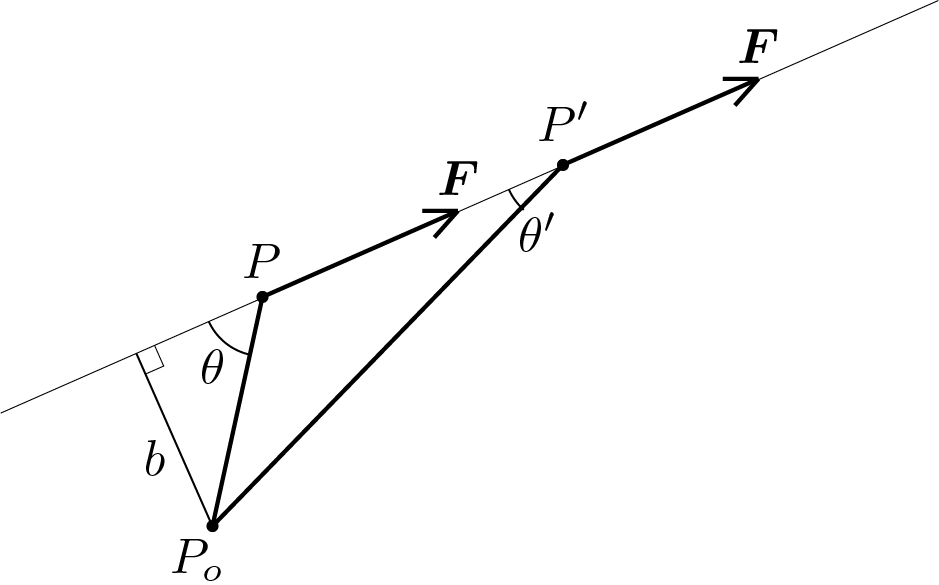 Then \(b\) is the distance between the pole \(P_o\) and the line of application of the force \(\vec{F}\text{.}\) It worth of notig that if \(\theta=0\) or \(\theta=\pi\text{,}\) i.e. vectors \(\left( \vec{X} - \vec{X}_o\right)\) and \(\vec{F}\) are parallel, the moment \(\calvec{M}_o\) is null.