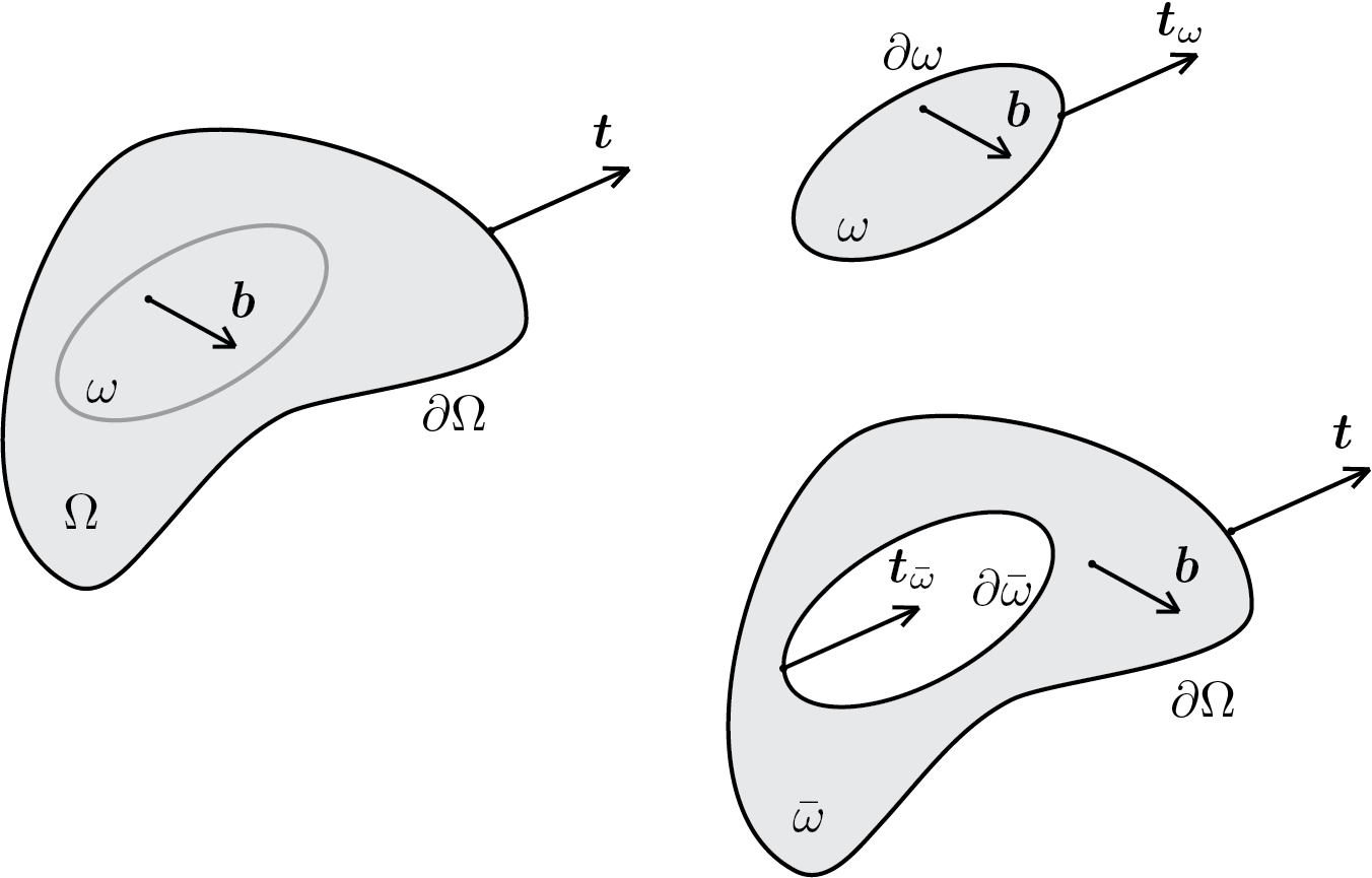 where \(\vec{t}_{\omega}\) is the action exerted on \(\omega\) by the other part of the domain \(\bar{\omega}\) and, on the contrary, \(\vec{t}_{\bar{\omega}}\) is the action exerted on \(\bar{\omega}\) by the other resulting part \(\omega\text{.}\)