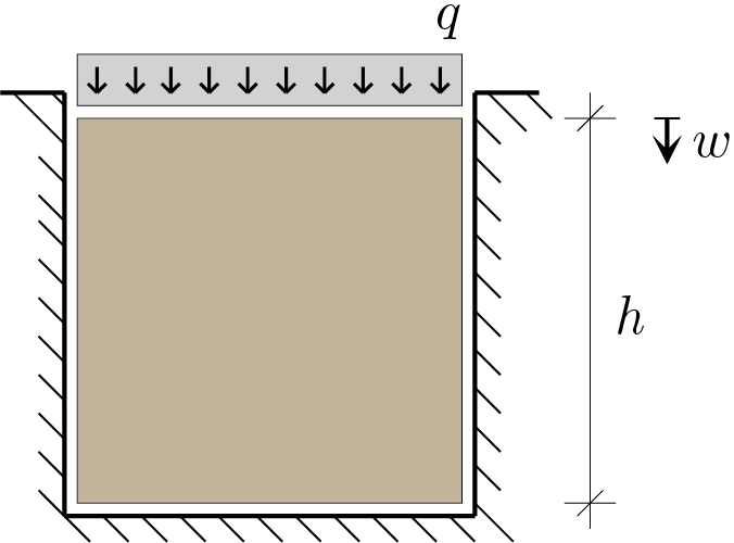 Under plane condition, calculate the stress state induced by the application of the load \(q\) and the lowering at the top \(w\text{.}\)
