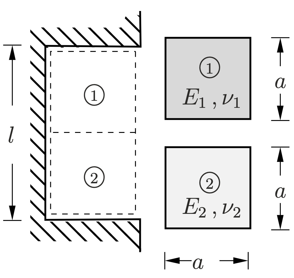 Two square panels of different material are inserted into the cavity with height \(l \) less than \(2a \text{.}\) The elastic problem is solved by assuming no friction phenomena along the cavity walls.