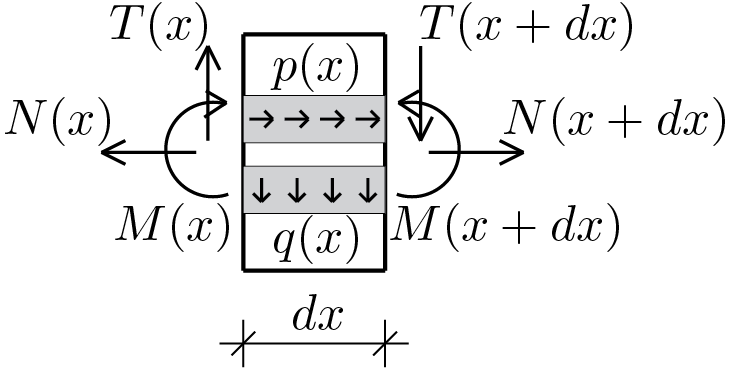 Let us consider a beam subjected to generic loading conditions, let us assume to isolate a portion of the beam with infinitesimal length \(dx\text{.}\) The beam’s portion thus identified is subjected to a series of actions shown in the figure and which, for clarity, are listed below: