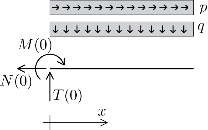 The diagram shows the case of a beam of which the values of the stress components at the extreme \(x = 0 \) are known and is subjected to constant distributed loads. In this case the general integrals (5.8.10), (5.8.11) and (5.8.12) take the following expressions