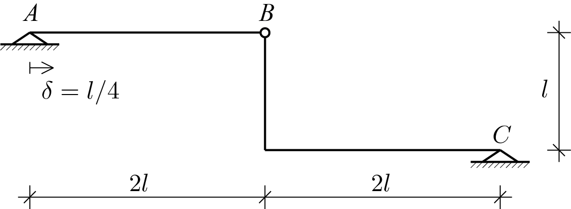 Dal momento che il \(\textrm{min}(m,n) = 3 == \textrm{rango}\mat{A}\) e \(n == m\) allora il sistema è cinematicamente determinato. La soluzione del sistema lineare fornisce infine i valori assunti dai parametri lagrangiani \(u_{1A}\text{,}\)\(u_{2A}\) e \(\varphi_{A}\) i quali in questo caso sono identicamente nulli.