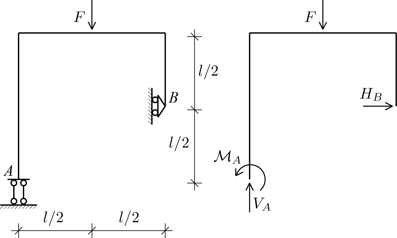 Si consideri il seguente portale soggetto ad una forza verticale applicata nella mezzeria del traverso. I vincoli (\(m=3\)) sono applicati al piede dei ritti e la loro rimozione e la successiva applicazione delle componenti di reazione vincolare conduce al diagramma di corpo libero riportato in figura insieme allo schema assegnato.