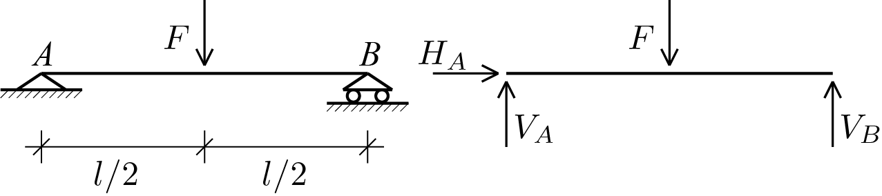 Si consideri una trave vincolata nella maniera indicata in figura e soggetta ad una forza verticale in mezzeria. La stessa figura riporta anche il diagramma di corpo libero ottenuto rimuovendo la cerniera e il carrello facendo seguire l’applicazione delle relative componenti di reazione vincolare (\(m=3\)).