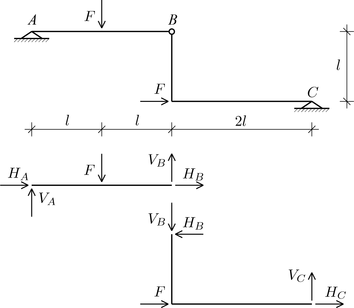 Si consideri il seguente sistema costituito da due corpi connessi mediante una cerniera interna. La rimozione di tutti i gradi di vincolo (\(m=6\)) e la successiva applicazione delle componenti di reazione vincolare conduce al diagramma di corpo libero riportato in figura insieme allo schema assegnato.