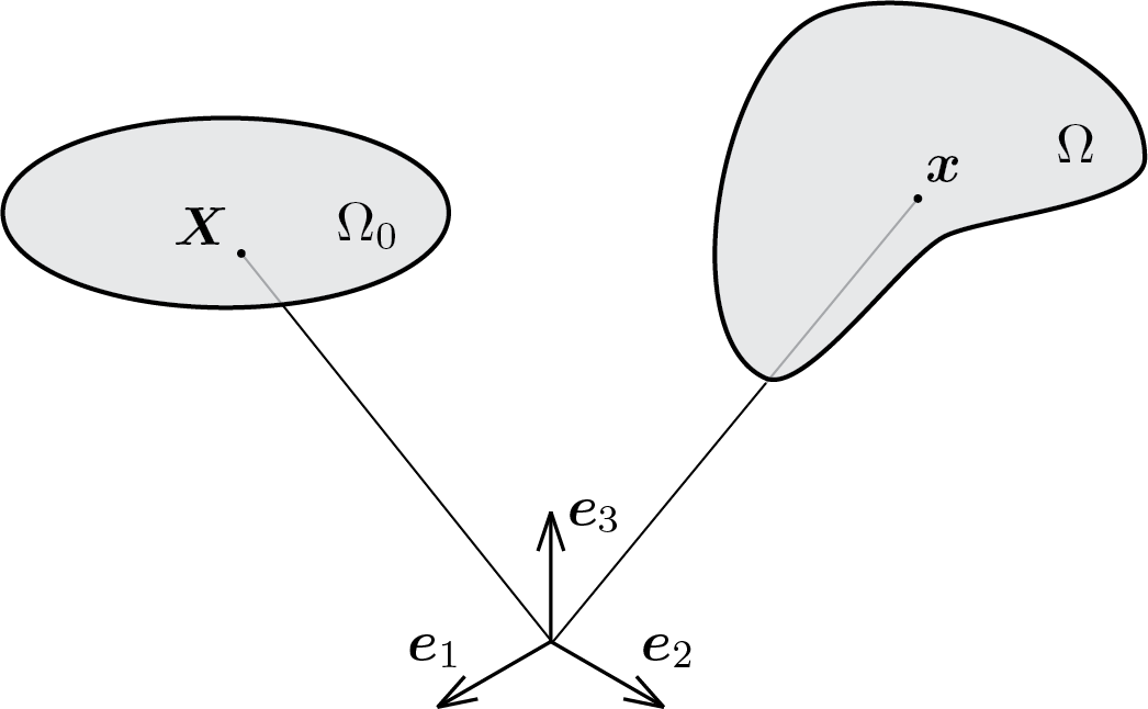 L’oggetto dell’analisi cinematica è un corpo continuo che sarà denominato con il simbolo \(\body\text{.}\) Ciascun punto del corpo occupa nello spazio una posizione che, fissata una terna ortonormale di riferimento \(\vec{e}_a\) (\(a=1,2,3\)), è individuata da un vettore. A tal riguardo parleremo di due configurazioni: