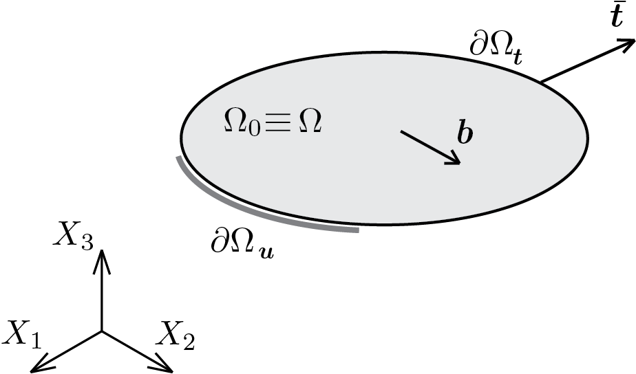 Per completare la formulazione del problema è necessario assegnare anche le condizioni al contorno che, in generale, possono essere di due tipi: di tipo statico sulla parte di contorno \(\partial\body_{\vec{t}}\) e di tipo cinematico sulla parte di contorno \(\partial\body_{\vec{u}}\text{.}\) Si osserva che \(\partial\body=\partial\body_{\vec{u}}+\partial\body_{\vec{t}}\text{.}\)