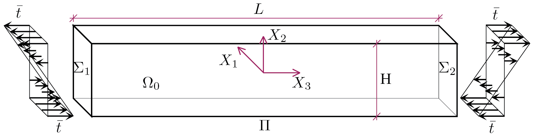 dove \(H\) rappresenta l’altezza del solido lungo la direzione \(X_2\) e \(\bar{t}\) è l’intensità della trazione applicata sui lembi superiore ed inferiore.