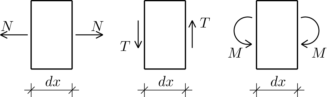 Applicando la procedura di sezionamento due volte al fine di isolare un tratto di trave di lunghezza infinitesima è possibile ottenere il seguente schema (dove è stato reso evidente anche l’altezza della trave) utile ad evidenziare la convenzione correntemente utilizzata per definire le sollecitazioni di segno positivo (per maggiore chiarezza le sollecitazioni sono raprresentate separatamente).