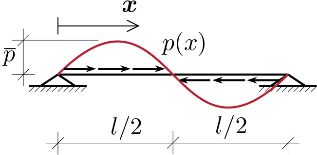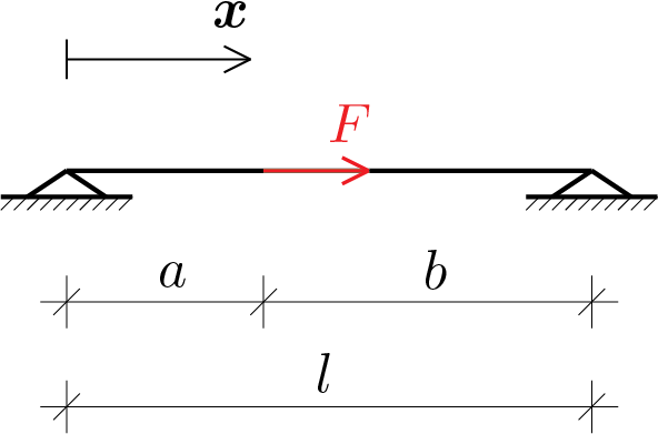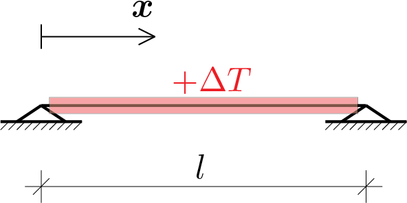 dove \(\alpha\) rappresenta il coefficiente di dilatazione termica del materiale. Tale allungamento è comunque impedito dalla presenza dei vincoli pertanto la trave sarà anche soggetta ad uno sforzo normale calcolabile dalla seguente equazione